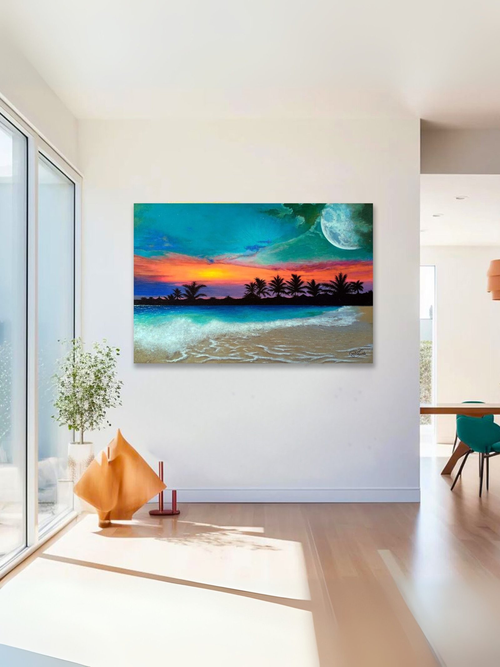 Beach Moon Waves Night Acrylic Painting by Ayesha Art Gallery – Wall Art