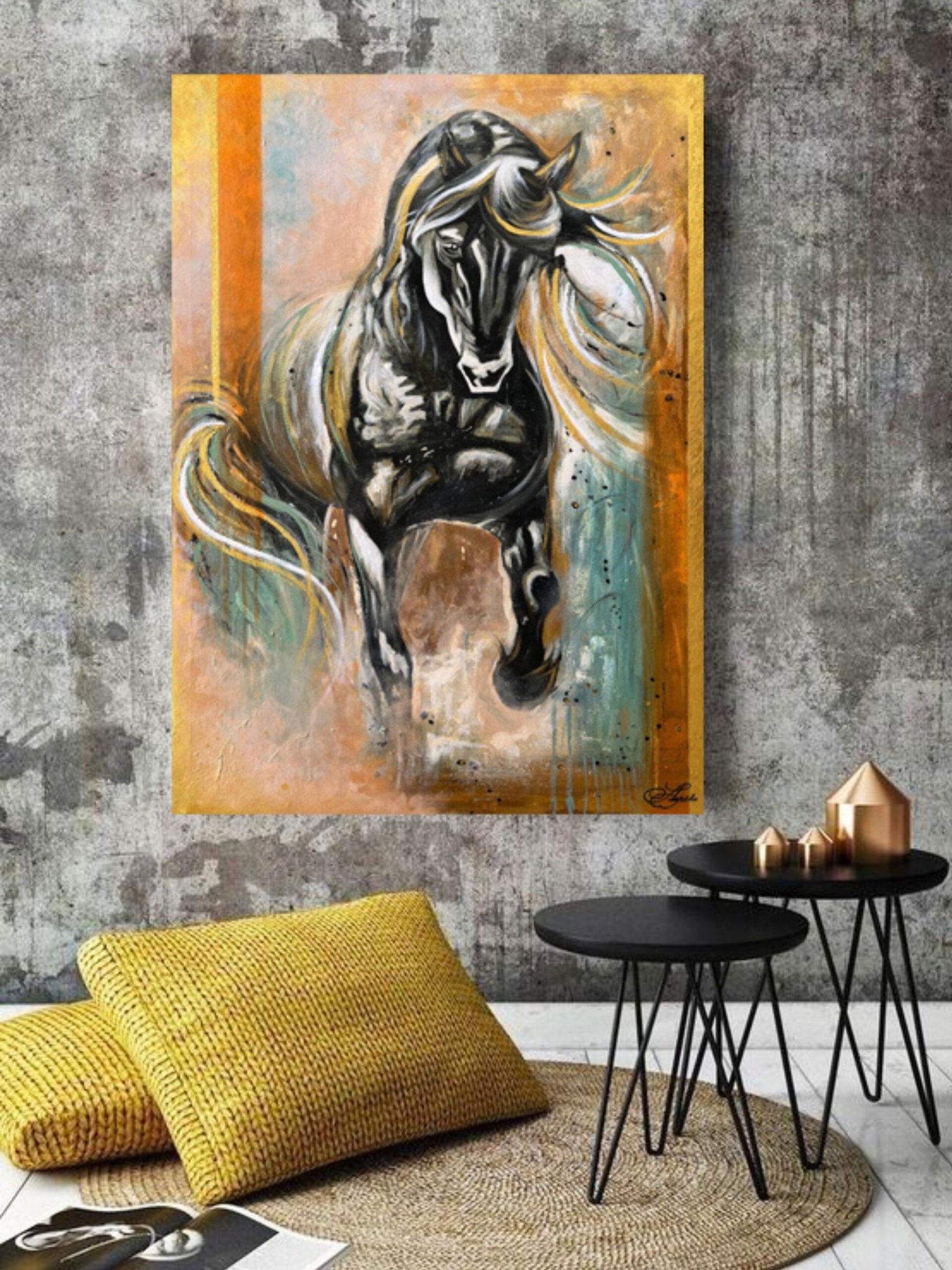Crafted with passion and precision, this painting blends bold textures with rich, dramatic tones that highlight the horse as a symbol of strength, freedom, and untamed beauty. The abstract composition allows the viewer to feel the energy and motion of the subject while offering a contemporary artistic appeal that complements both minimalistic and luxurious décor themes.