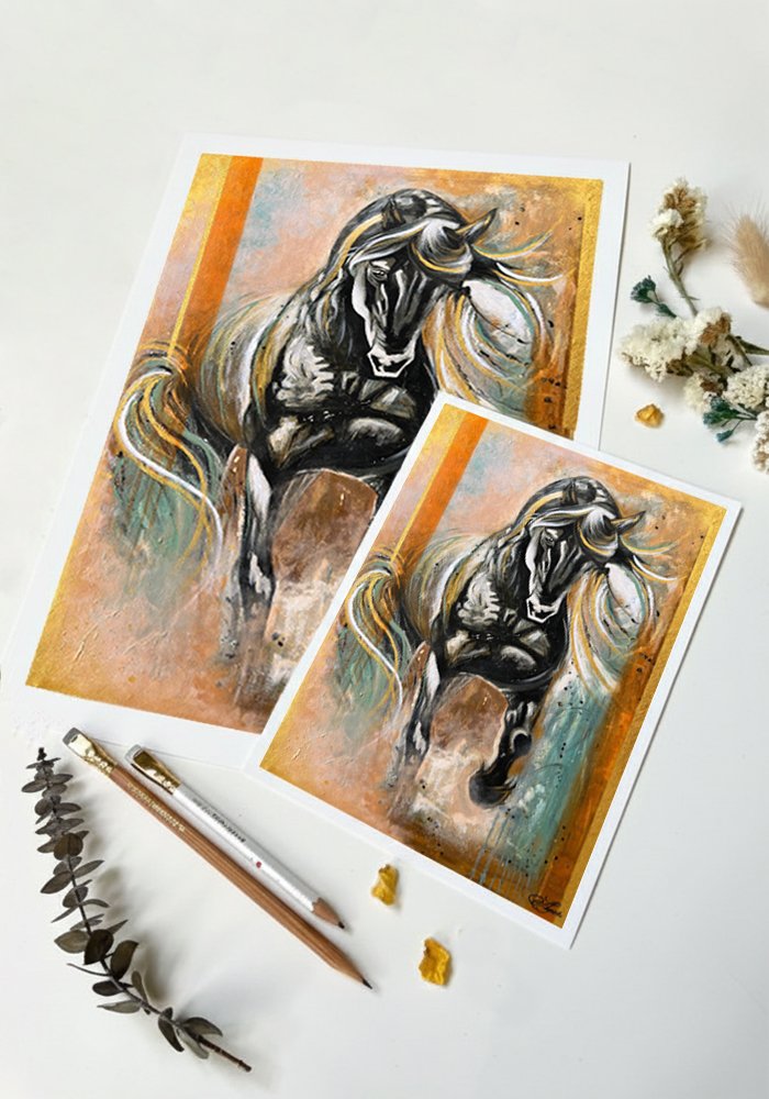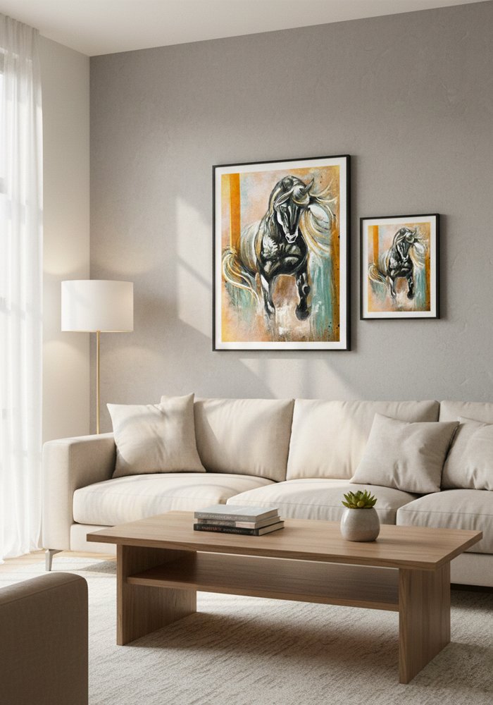 The ”Black Horse” Fine Art Print by Ayesha Art Gallery captures the majestic spirit of strength and freedom through refined artistic detail. Printed with premium quality for lasting beauty, this artwork enhances homes, offices, and galleries with elegance, energy, and expressive visual impact.