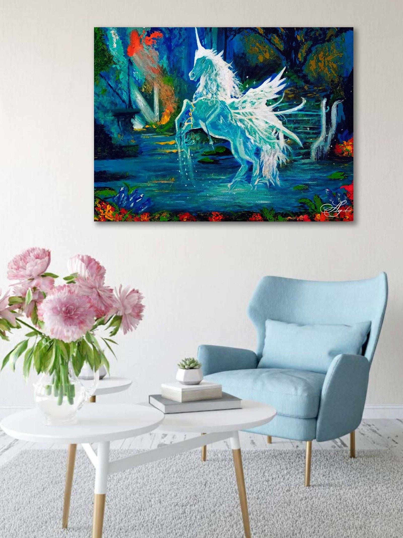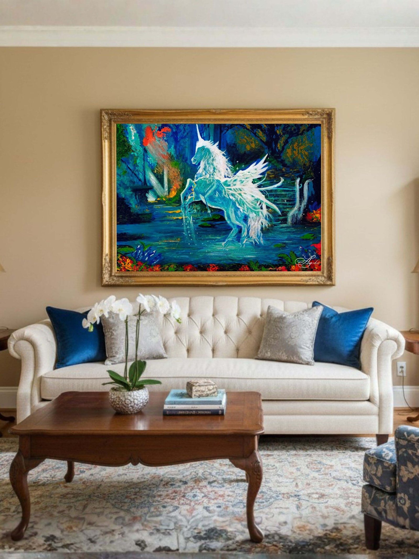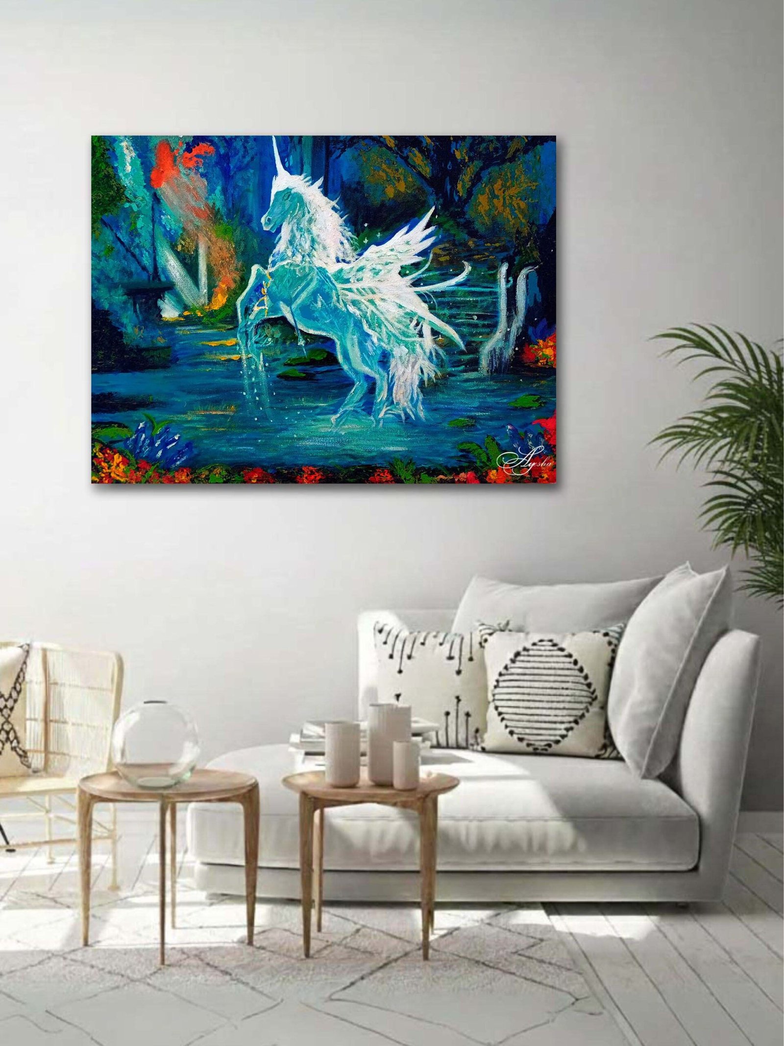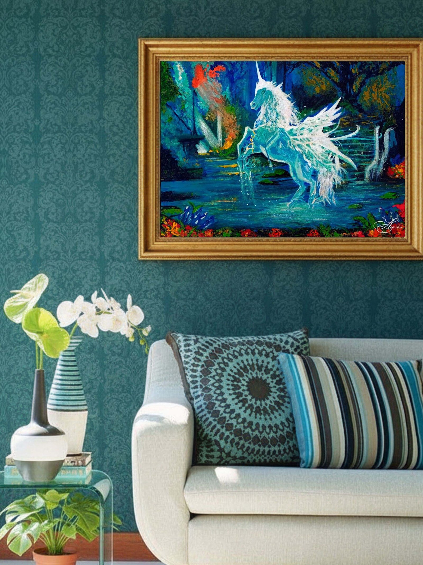 This one-of-a-kind fantasy painting is ideal for art collectors, unicorn lovers, and those who appreciate mythical and symbolic art. It serves as a stunning statement piece for living rooms, bedrooms, studios, creative spaces, or art galleries. The artwork also makes a meaningful gift for fantasy art enthusiasts.