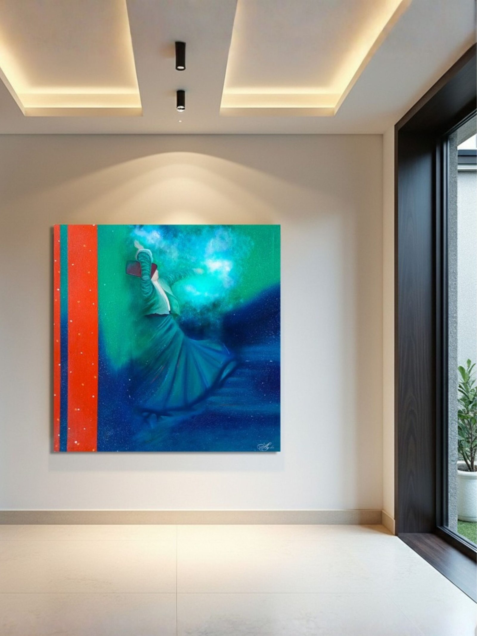 The Sufi Rumi Whirling Dervish Painting by Ayesha Art Gallery reflects spiritual depth, movement, and inner peace. Hand-painted with expressive strokes, this artwork captures the essence of Sufi philosophy, making it perfect for meditation spaces, homes, and art collections seeking meaning and elegance.